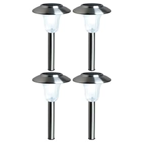 The Westinghouse 4 Piece Kimberly solar Lights set is stainless steel construction with a ribbed glass lens. The light source is 2 patented white LED bulbs. The set includes pole and ground steak. Two 600MAH batteries are included.